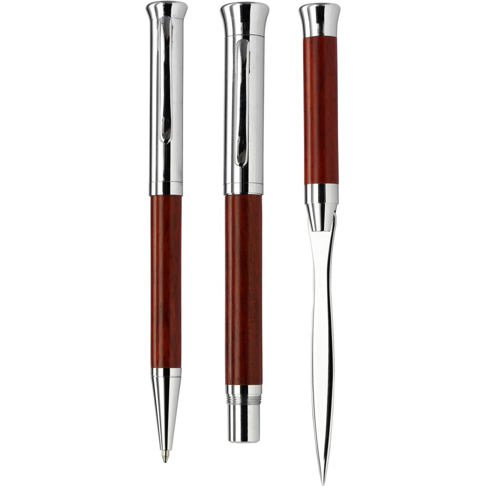 Entdecken Sie unser hochwertiges Schreibset, das mit einem Füller, einem Kugelschreiber und einem Brieföffner in einem eleganten Holzkasten begeistert. Mit kompakten Maßen von 21 x 10,2 x 4,7 cm und einem Gesamtgewicht von 391 g ist es nicht nur ein praktischer Begleiter im Büro, sondern auch ein stilvolles Statement Ihrer Marke.